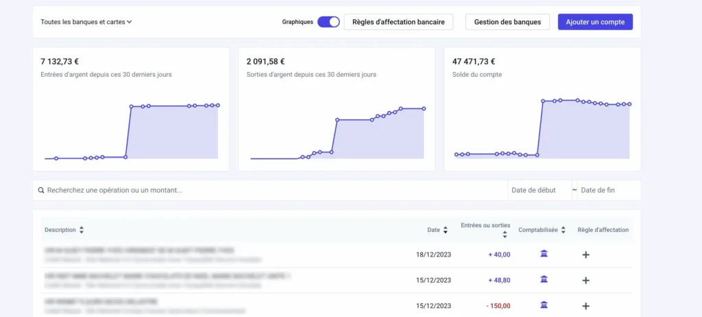 Indicateurs automatisés : Suivez les entrées et sorties d’argent des 30 derniers jours et votre solde en temps réel.