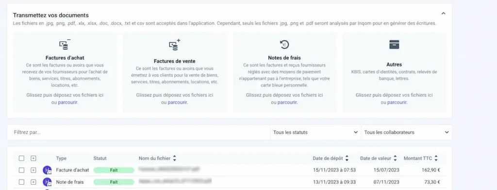 Transmission simple : Glissez-déposez vos factures (achat/vente) et notes de frais directement dans l’application.